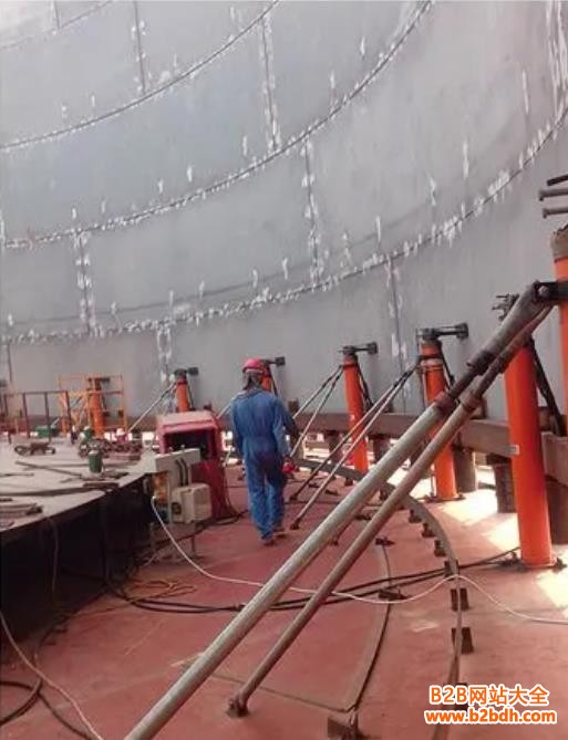 液压顶升设备支架总成施工方法有以下六种:液压提升倒装、中心柱倒装,充气顶升倒装、水浮倒装、正装法、机械顶升倒装。在先期施工的罐底板上安装数个固定垫墩 (400mm 高 , 间距 3-4 米 ), 然后组装层壁板和顶盖板 , 沿罐内壁 400mm 处均布数台(根据计算确定)液压提升机,以提升机的滑动托架托住固定在罐内壁的胀圈下部 , 操纵液压提升机的控制柜,集中控制各液压机的动作.